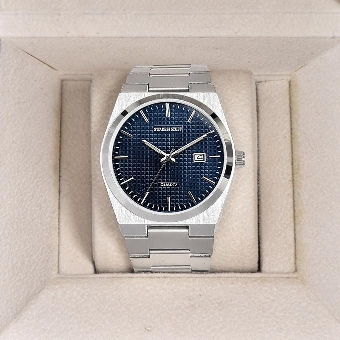 men, watchSWADESI STUFF Stainless Steel Date Display Mens Wrist Analogue Watch, Dial-Color:Multicolour, Band Color:Silver