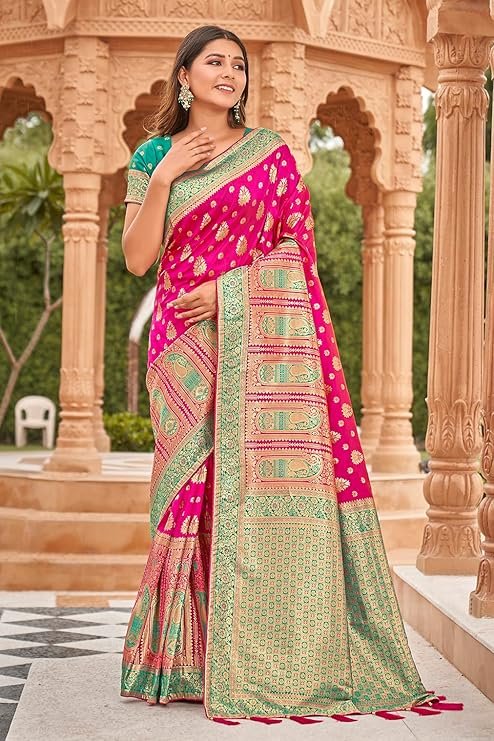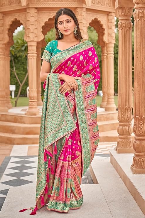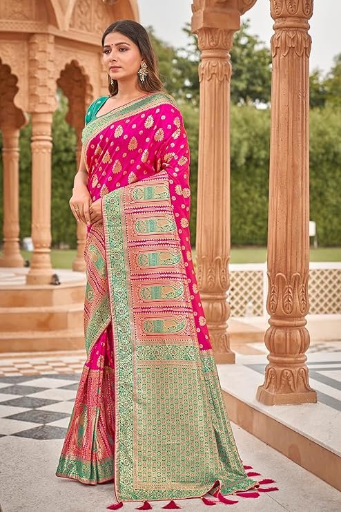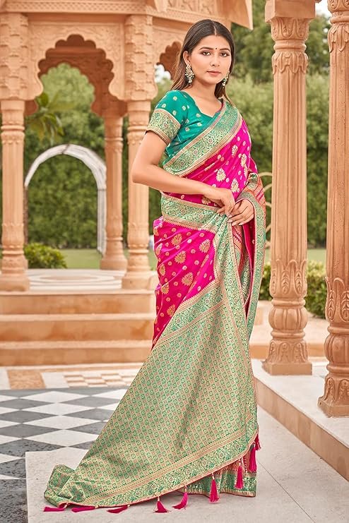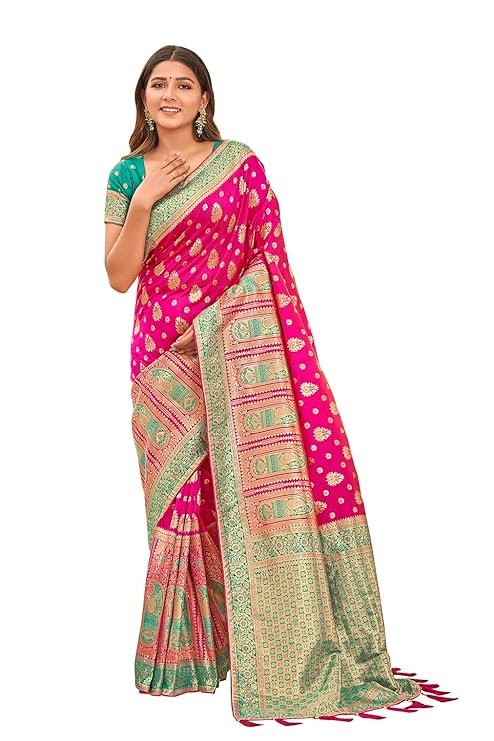 - Product Highlights : Fabric: Banarasi Silk (Saree & Blouse) || Work: Rich Zari Work (Saree), Zari Woven (Blouse) || Colour: Saree – Bright Pink| Blouse –Turquoise|| Length: Saree – 5.5m | Blouse Piece – 0.8m (Unstitched) || Size: Free Size || Package Includes: 1 Saree with Attached Blouse Piece