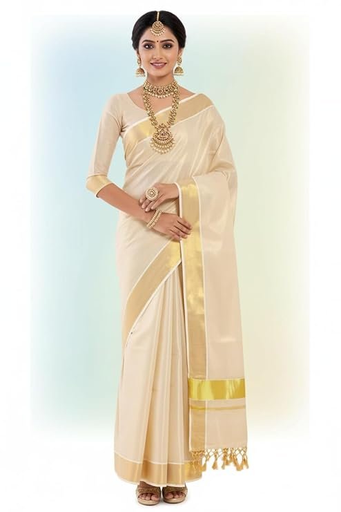 Women’s Kerala Tissue Plain Saree with Running Blouse| Onam & Vishu Kani Special | Traditional Kasavu White Colour